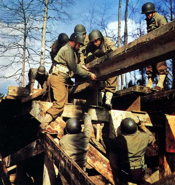 Engineer soldiers train in the bridge-making prior to their deployment in Europe. They are wearing the wool uniform with M41 field jacket. Of special interest are the toe-capped service shoes being worn under the leggings. These shoes, which featured a smooth outside surface and toe-cap, would have been replaced in the ETO by the more common rough-out service shoes. The rough-out service shoes would have featured the rough side of the leather on the outside of the shoe and no toe-cap.